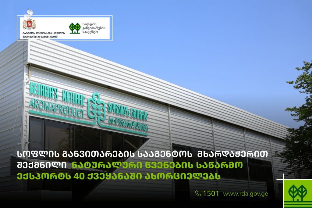 ორგანული წვენების საწარმო „Georgias Natural” სოფლის განვითარების სააგენტოს ფინანსური მხარდაჭერით შეიქმნა. საწარმოში, ჯამურად, 8 მლნ ლარის ინვესტიცია განხორციელდა; მათ შორის 6,9 მლნ ლარი შეღავათიანი აგროკრედიტია, 500,000 საგრანტო თანადაფინანსება. საწარმოში, სადაც წელიწადში 3,000 ტონაზე მეტი ხილი და ბოსტნეული გადამუშავდება, მუდმივად 60 ადამიანია დასაქმებული. პროდუქციის რეალიზაცია ხორციელდება, როგორც ადგილობრივ ბაზარზე, ასევე გადის ექსპორტზე მსოფლიოს 40 ქვეყანაში.