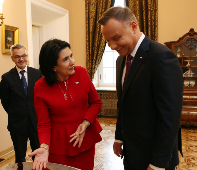 პოლონეთის დედაქალაქში დახვედრის ოფიციალური ცერემონიის შემდეგ პრეზიდენტებმა სამახსოვრო საჩუქრები გაცვალეს.