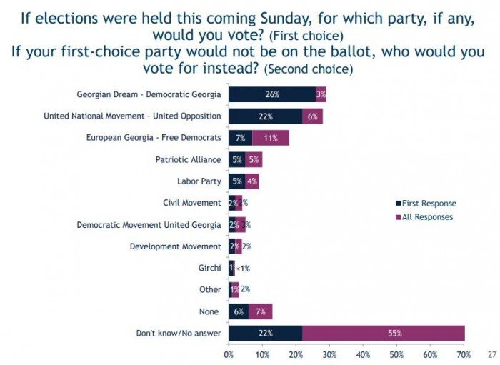 სხვა პარტიების შედეგი ასეთია: „ევროპული საქართველო“ – 7 პროცენტი, „პატრიოტთა ალიანსი“ – 5 პროცენტი, „ლეიბორისტული პარტია“ – 5 პროცენტი, „სამოქალაქო მოძრაობა“ – 2 პროცენტი, „დემოკრატიული მოძრაობა ერთიანი საქართველოსთვის“ – 2 პროცენტი, „შენების მოძრაობა“ – 2 პროცენტი, „გირჩი“ – 1 პროცენტი, სხვა – 1 პროცენტი, არც ერთი – 6 პროცენტი, არ ვიცი – 22 პროცენტი.