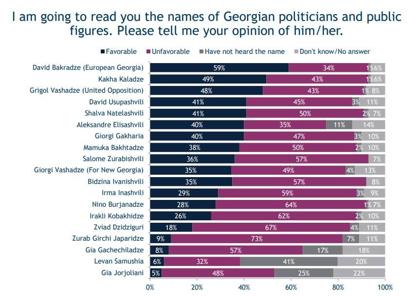 რეიტინგის სათავეში „ევროპული საქართველოს“ ლიდერი დავით ბაქრაძეა – დადებითი 59%, უარყოფითი 34%, არ მსმენია 1%, არ ვიცი 6%.