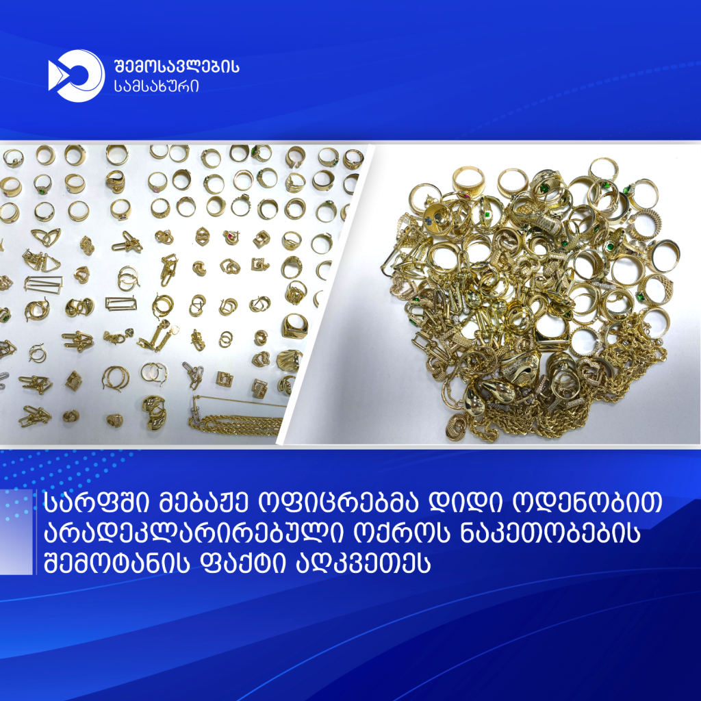 საბაჟო კონტროლის ფარგლებში, მებაჟე ოფიცრებმა ეჭვის საფუძველზე, უცხო ქვეყნის მოქალაქის ფიზიკური დათვალიერების შედეგად, მალულად განთავსებული 358 გრამი ოქროს საიუველირო ნაკეთობები აღმოაჩინეს.