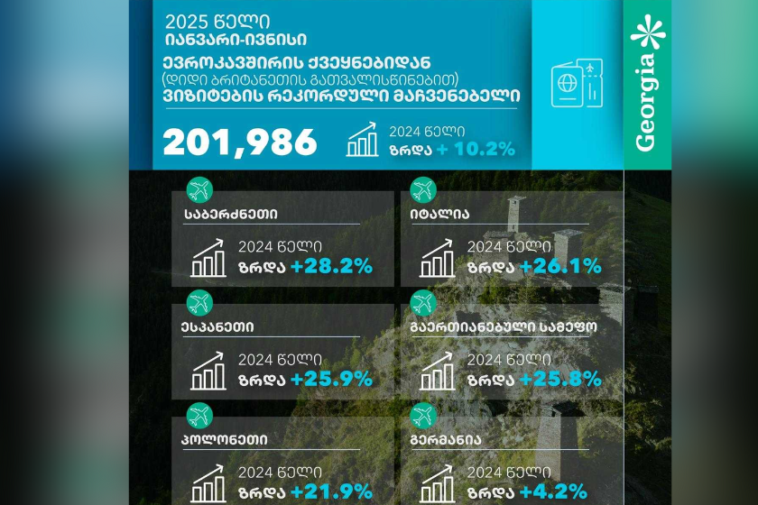 ვიზიტორთა რაოდენობამ ახალ რეკორდულ მაჩვენებელს მიაღწია. 2025 წლის პირველ ორ კვარტალში ევროკავშირიდან და დიდი ბრიტანეთიდან საქართველოში 201,986 საერთაშორისო ვიზიტი განხორციელდა, რაც 2024 წლის ანალოგიურ პერიოდთან შედარებით +10.2%-იანი ზრდაა.