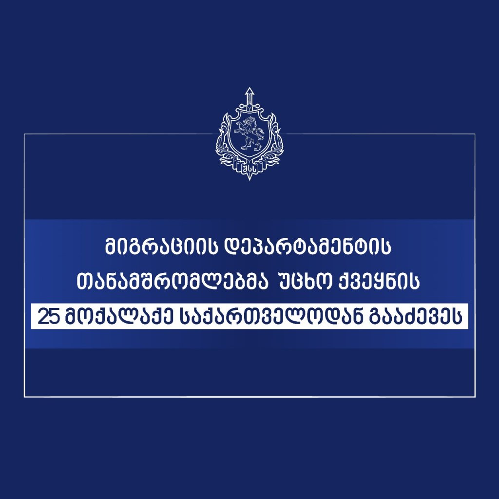 საქართველოს შინაგან საქმეთა სამინისტროს მიგრაციის დეპარტამენტისა და სამინისტროს შესაბამისი დანაყოფების მჭიდრო კოორდინაციით, ბოლო დღეებში ჩატარებული კომპლექსური ღონისძიებების ფარგლებში, საქართველოდან უცხო ქვეყნის 25 მოქალაქის გაძევება განხორციელდა.