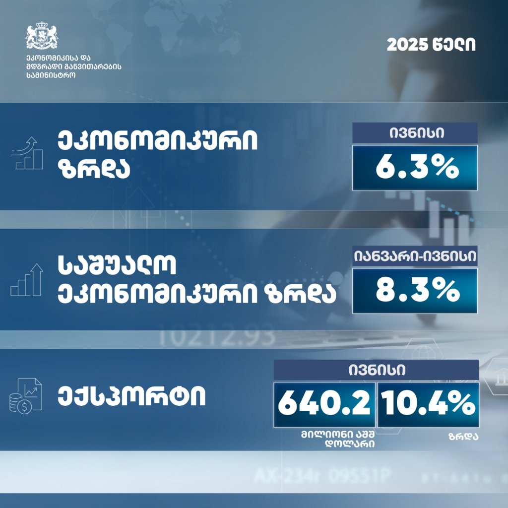 საქართველოს ეკონომიკის მაღალი ზრდის ტენდენცია 2025 წლის პირველ ნახევარშიც გრძელდება - წლის პირველ კვარტალში ეკონომიკური ზრდა 9.8% იყო, აპრილსა და მაისში ზრდამ 7.5%, ხოლო ივნისში - 6.3% შეადგინა. საერთო ჯამში, 2025 წლის იანვარ-ივნისის საშუალო ეკონომიკური ზრდა 8.3%-ით განისაზღვრა.