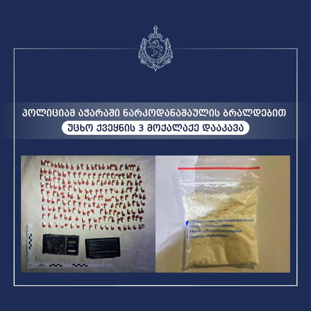 შინაგან საქმეთა სამინისტროს აჭარის პოლიციის დეპარტამენტის თანამშრომლებმა, ჩატარებული ოპერატიული ღონისძიებებისა და საგამოძიებო მოქმედებების შედეგად, დიდი და განსაკუთრებით დიდი ოდენობით ნარკოტიკული საშუალებისა და ფსიქოტროპული ნივთიერების უკანონო შეძენა-შენახვის ბრალდებით უცხო ქვეყნის 3 მოქალაქე დააკავეს. ინფორმაციას შსს ავრცელებს.