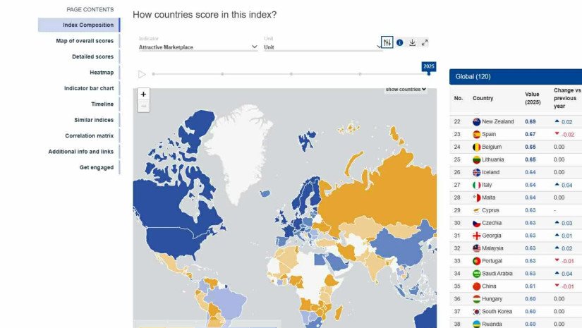 ევროკომისიამ კარგი მთავრობის 2025 წლის ანგარიშის ფარგლებში, მიმზიდველი საბაზრო ეკონომიკის ინდექსი გამოაქვეყნა. საქართველომ შეფასების 100-პროცენტიანი სისტემით, ახალი ისტორიული მაქსიმუმი_63.2% მიიღო და მსოფლიოში 30-ე ადგილზე გავიდა.