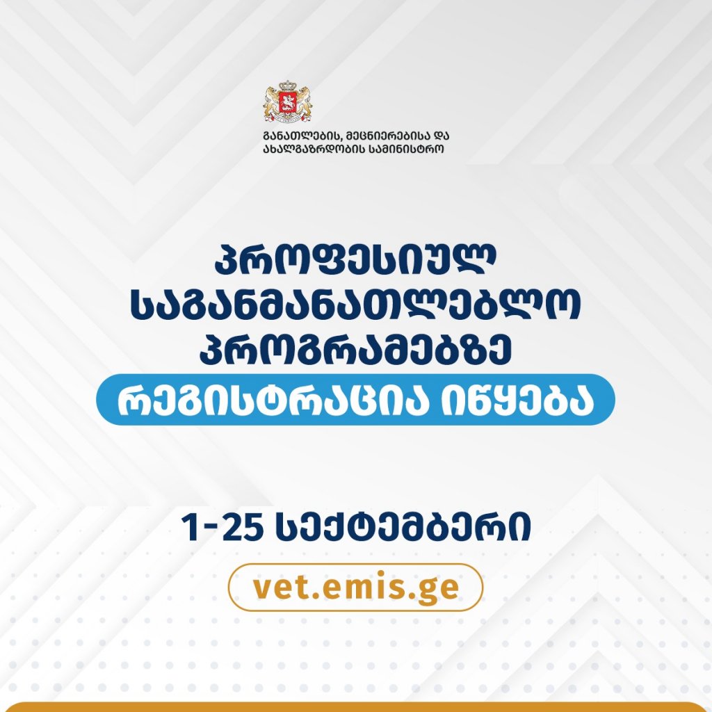 პროფესიულ საგანმანათლებლო პროგრამებზე რეგისტრაცია 2025 წლის 1 სექტემბერს დაიწყება და 25 სექტემბრის ჩათვლით გაგრძელდება.