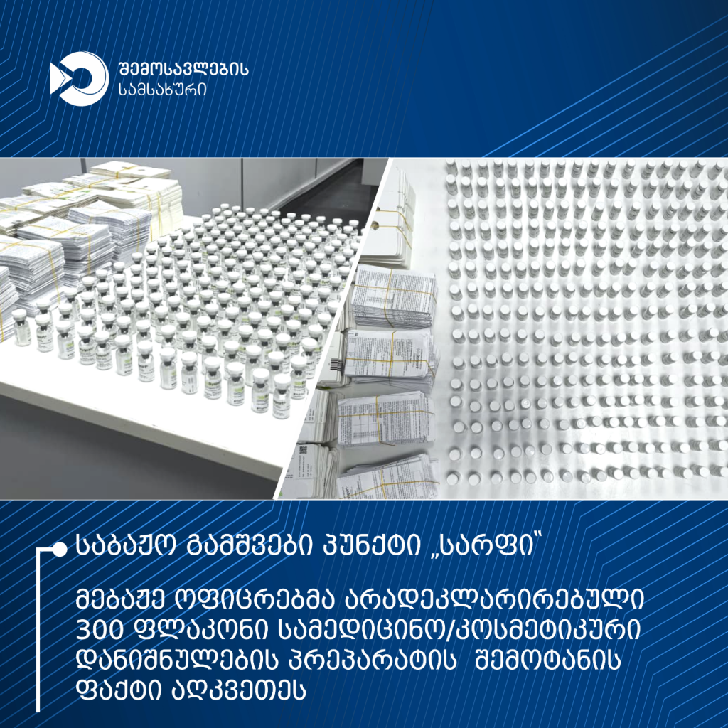 კერძოდ, მებაჟე ოფიცრებმა ეჭვის საფუძველზე, საქართველოს მოქალაქის მართვის ქვეშ არსებული სატრანსპოტო საშუალების დეტალური დათვალიერების შედეგად, არადეკლარირებული 300 ფლაკონი სამედიცინო/კოსმეტიკური დანიშნულებისთვის განკუთვნილი საინექციო პრეპარატი გამოავლინეს.