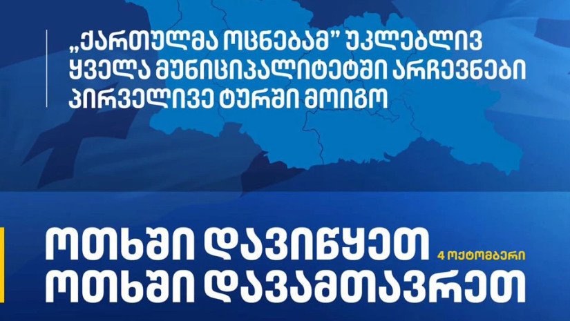„ქართულმა ოცნებამ“ უკლებლივ ყველა მუნიციპალიტეტში არჩევნები პირველივე ტურში მოიგო. ოთხში დავიწყეთ, ოთხში დავამთავრეთ“, - წერია ბანერზე, რომელიც პარტიის ფეისბუკგვერდზე გამოქვეყნდა.