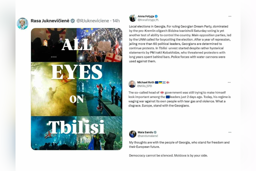 ლიეტუველმა ევროპარლამენტარმა რასა იუკნევიჩიენემ გამოაქვეყნა ძალადობრივი პროტესტის ფოტოებისგან შემდგარი ბანერი წარწერით: "ყველას მზერა თბილისისკენაა მიმართული", მანამდე კი, იუკნევიჩიენე წერდა: "საქართველოს სჭირდება ჩვენი ყურადღება და მხარდაჭერა. დღეს ერთ-ერთი ყველაზე მნიშვნელოვანი საპროტესტო აქცია იმართება ევროპული საქართველოსთვის".
