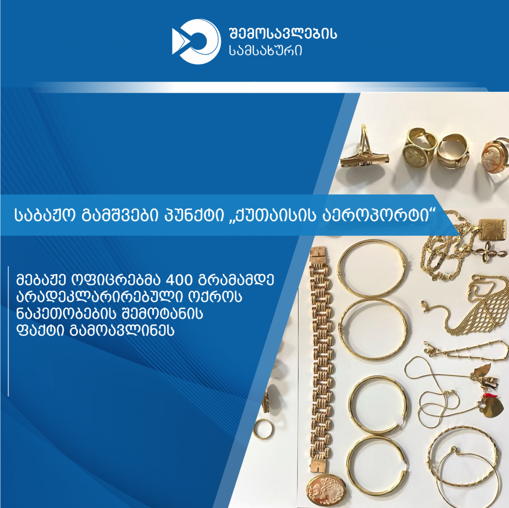 01 - 15 ოქტომბერს, ფინანსთა სამინისტროს შემოსავლების სამსახურის საბაჟო გამშვებ პუნქტში ,,ქუთაისის აეროპორტი", კანონდარღვევის 4 ფაქტი აღიკვეთა. კერძოდ, მებაჟე ოფიცრებმა ეჭვის საფუძველზე, საქართველოს მოქალაქეების, როგორც ფიზიკური, ასევე კუთვნილი ბარგის დეტალური დათვალიერების შედეგად, ჯამში 400 გრამამდე არადეკლარირებული ოქროს საიუველირო ნაკეთობები და მონეტები აღმოაჩინეს.