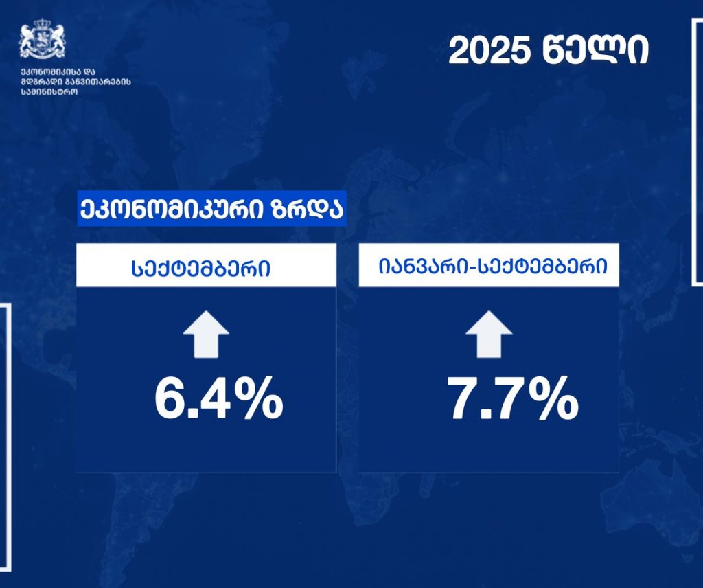 მაღალი ეკონომიკური ზრდის ტენდენცია გრძელდება - 2025 წლის იანვარ-სექტემბრის საშუალო ეკონომიკური ზრდა 7.7%-ით განისაზღვრა. პირველ კვარტალში ეკონომიკურმა ზრდამ 9.8%, მეორე კვარტალში 7.3%, მესამე კვარტალში კი 6.5% შეადგინა. რაც შეეხება ბოლო სამი თვის მაჩვენებლებს: ივლისში ეკონომიკური ზრდა 6.5%, აგვისტოში - 6.6%, ხოლო სექტემბერში 6.4%-ით განისაზღვრა.