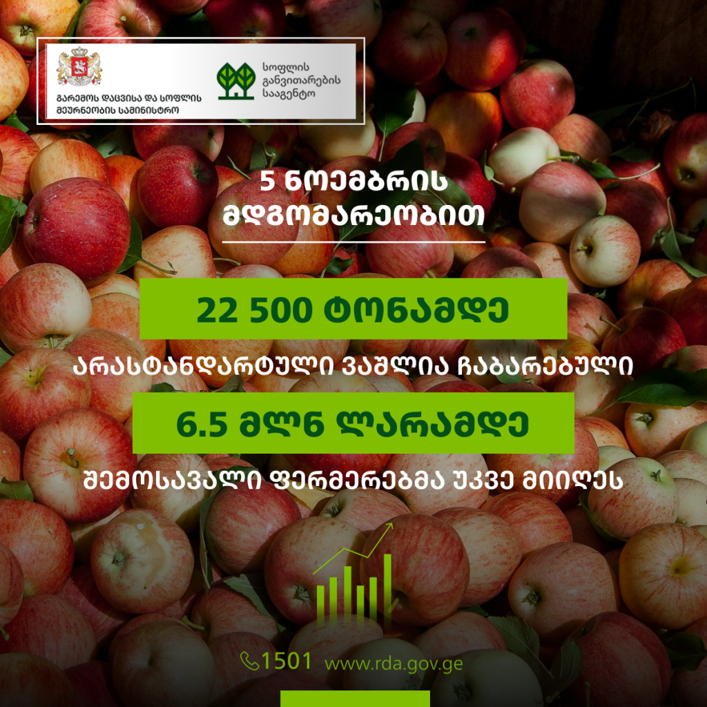 მიმდინარე წლის 9 სექტემბრიდან 5 ნოემბრამდე პერიოდში, სახელმწიფო პროგრამაში ჩართულმა ხილის გადამმუშავებელმა 15 საწარმომ 22,500 ტონამდე არასტანდარტული ვაშლი ჩაიბარა. შედეგად, ფერმერებმა 6.5 მლნ ლარამდე შემოსავალი მიიღეს, სახელმწიფო სუბსიდია დაახლოებით 2.5 მლნ ლარს შეადგენს.
