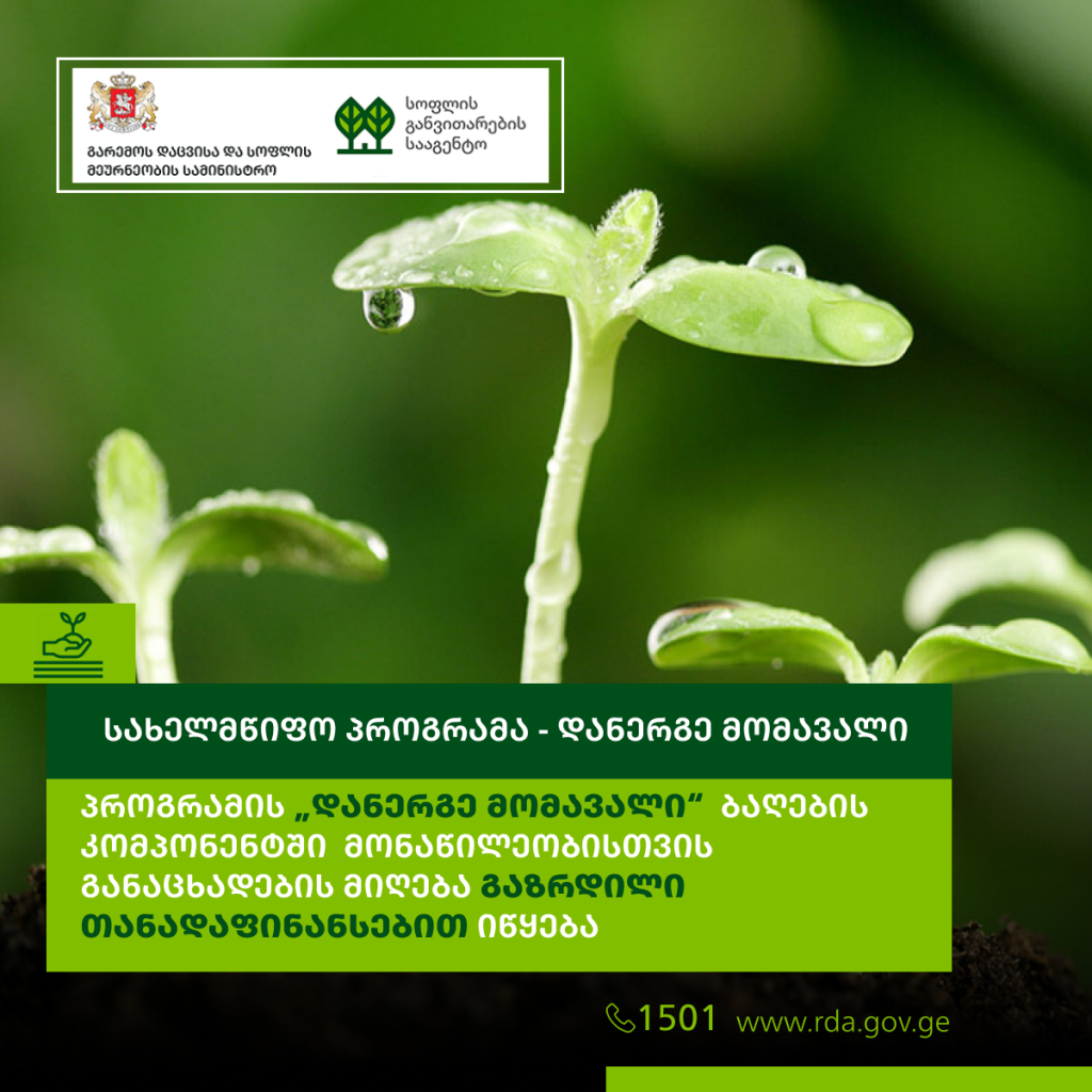 სოფლის განვითარების სააგენტო სახელმწიფო პროგრამაში „დანერგე მომავალი“ მონაწილეობისთვის განაცხადებს მიმდინარე წლის 10 ნოემბრის 12:00 საათიდან 2026 წლის 28 თებერვალამდე მიიღებს.