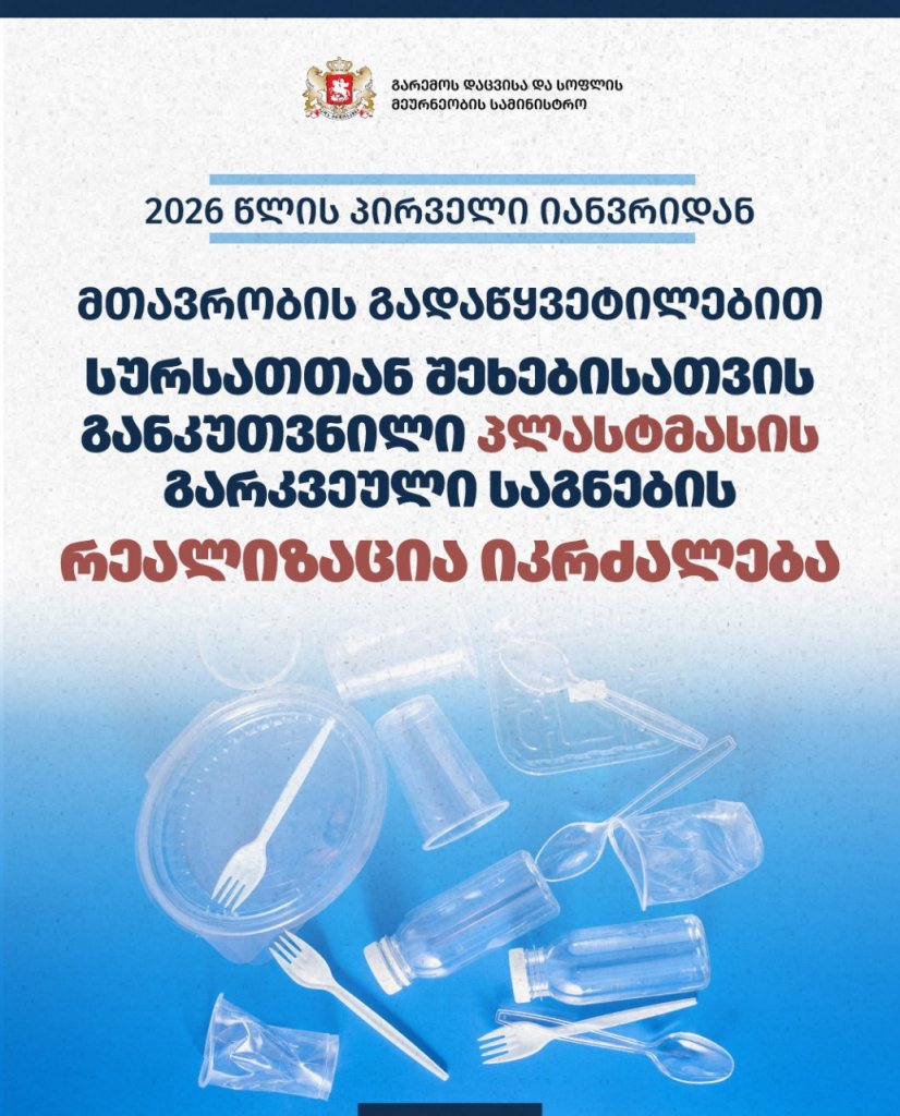 ასევე, პლასტმასისგან დამზადებული ერთჯერადი სასურსათო კონტეინერების და ჭიქების საშუალებით საზოგადოებრივი კვების ობიექტების მიერ მომხმარებლისთვის მზა სურსათის მიწოდება შესაძლებელია დადგენილების ამოქმედებიდან (2026 წლის 1 იანვრიდან) ექვსი თვის განმავლობაში.
