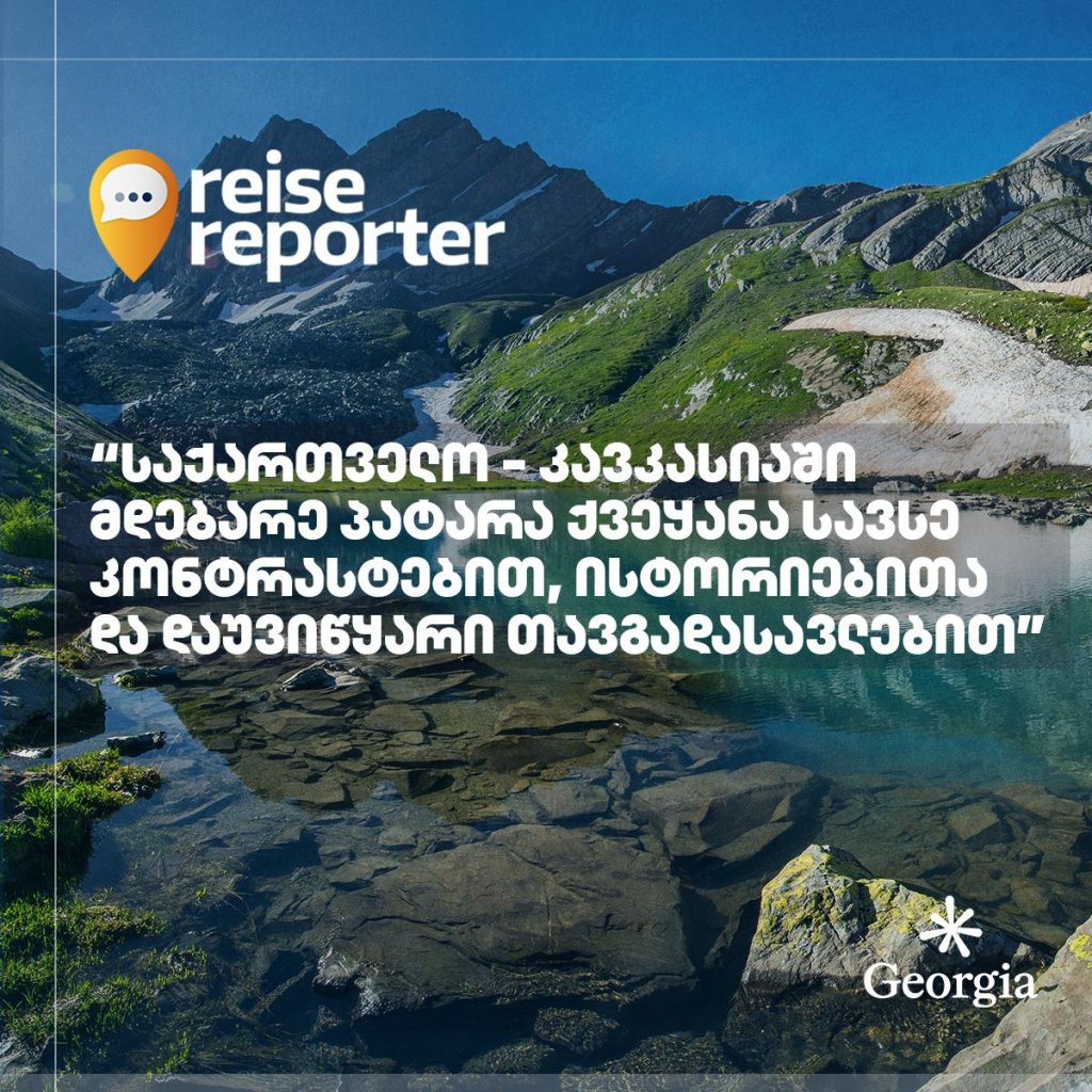 ცნობილგერმანულ სამოგზაურო პლატფორმა  Reisereporter საქართველოს ტურისტული პონტენციალის შესახებ სტატიას აქვეყნებს სათაურით ყველაზე შთამბეჭდავი ადგილები საქართველოში მოგზაურობისთვის“.