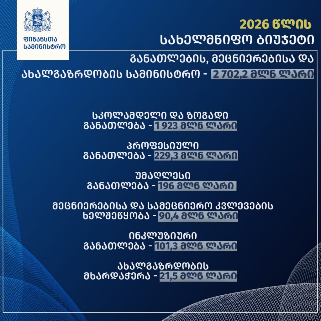 განათლების, მეცნიერებისა და ახალგაზრდობის სამინისტროს დაფინანსება პირველად პროექტთან შედარებით, 2026 წლის ბიუჯეტის საბოლოო ვარიანტში გაიზარდა, თითქმის, 90 მილიონი ლარით და 2 მილიარდ 700 მილიონ ლარს აჭარბებს.