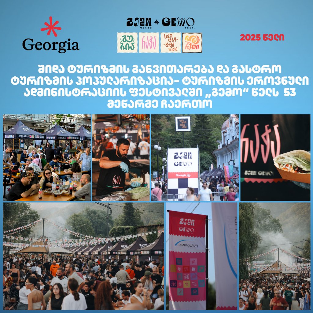 შიდა ტურიზმის განვითარებისა და გასტრო ტურიზმის პოპულარიზაციისთვის ტურიზმის ეროვნულმა ადმინისტრაციამ ფესტივალში „გემო“ 53 მეწარმე ჩაერთო