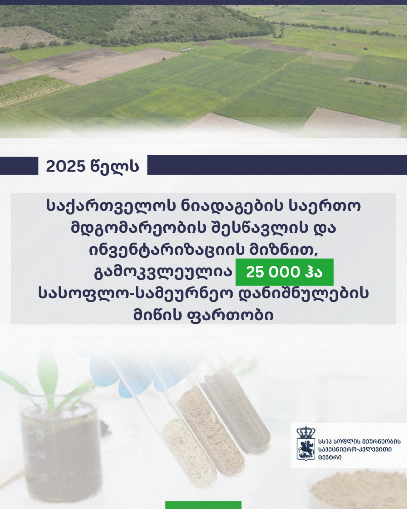 სსიპ სოფლის მეურნეობის სამეცნიერო-კვლევითი ცენტრის ნიადაგის ნაყოფიერების კვლევის სამსახურის მიერ, 2025 წელს, შვიდ მუნიციპალიტეტში შესწავლილ იქნა 25 000 ჰექტარი ნიადაგის ფართობი, ხოლო ლაბორატორიულ პირობებში ფიზიკურ, ქიმიურ და ფიზიკურ-ქიმიურ მახასიათებლებზე გაანალიზდა 413 ნიადაგის ნიმუში. მიღებული მონაცემები განთავსდა ერთიან ელექტრონულ ბაზაში, რომლის საფუძველზეც მიმდინარეობს ნიადაგის თემატური რუკების დამუშავება.