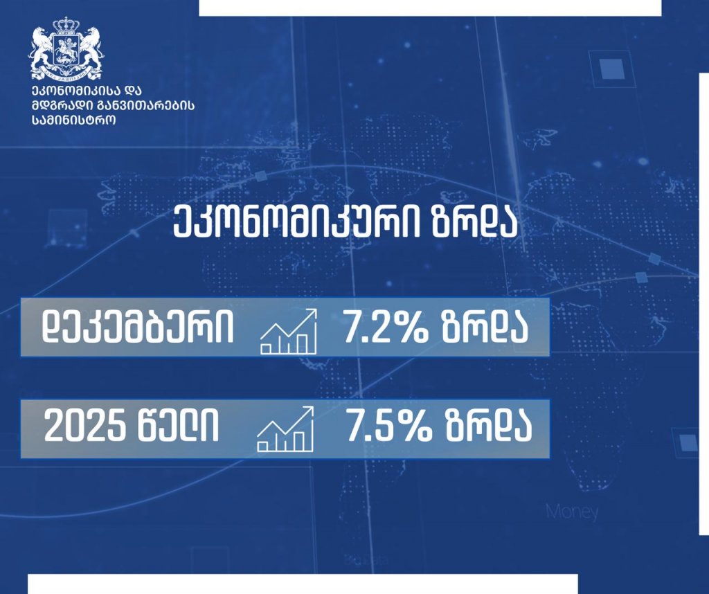 2025 წელს ეკონომიკური ზრდა 7.5%-ით განისაზღვრა, ხოლო დეკემბრის თვეში საქართველოს ეკონომიკის ზრდამ 7.2% შეადგინა.