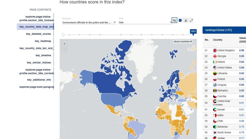ინდიკატორი ზომავს, „თავს იკავებენ თუ არა პოლიციის თანამშრომლები და კრიმინალური გამომძიებლები ქრთამის თხოვნისა და მიღებისგან ძირითადი საპოლიციო მომსახურების შესასრულებლად, ან დანაშაულების გამოსაძიებლად და არიან თუ არა პოლიციისა და სამხედრო სამსახურში მომუშავე სამთავრობო თანამდებობის პირები თავისუფალი კერძო ინტერესების, ან კრიმინალური ორგანიზაციების არასათანადო გავლენისგან“.