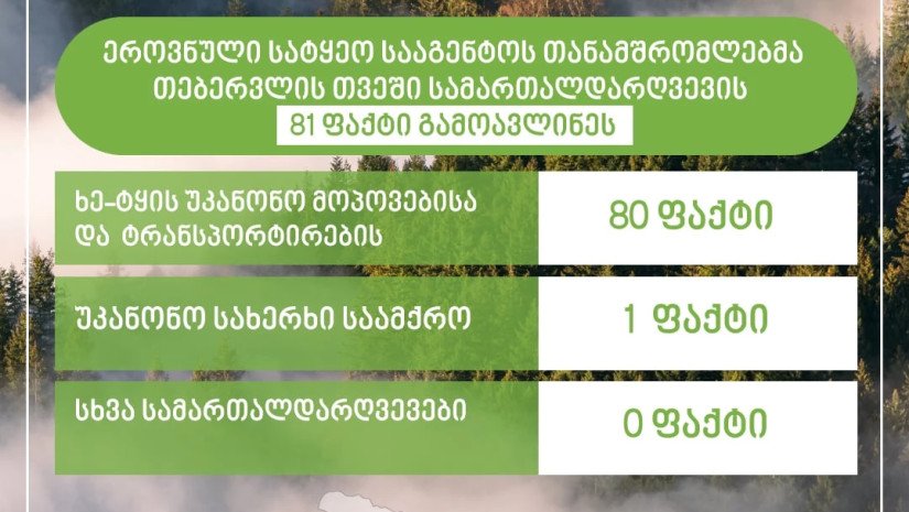 „ქვეყნის მასშტაბით ხე-ტყის უკანონოდ მოპოვების ფაქტებიდან 11 სამართალდარღვევა გამოვლენილია იმერეთის სატყეო სამსახურის თანამშრომლების მიერ, 6 - სამცხე-ჯავახეთის, 6 - რაჭა-ლეჩხუმი ქვემო სვანეთის, 11 - ქვემო ქართლის, 31 - კახეთის, მცხეთა-მთიანეთის - 3, გურია - 6, სამეგრელო-ზემო სვანეთის - 5, ხოლო 2 - შიდა ქართლის სატყეო სამსახურის თანამშრომლების მიერ; ასევე, იმერეთში გამოვლენილია 1 დაურეგისტრირებელი სახერხი საამქრო და უნებართვო სანახშირე.