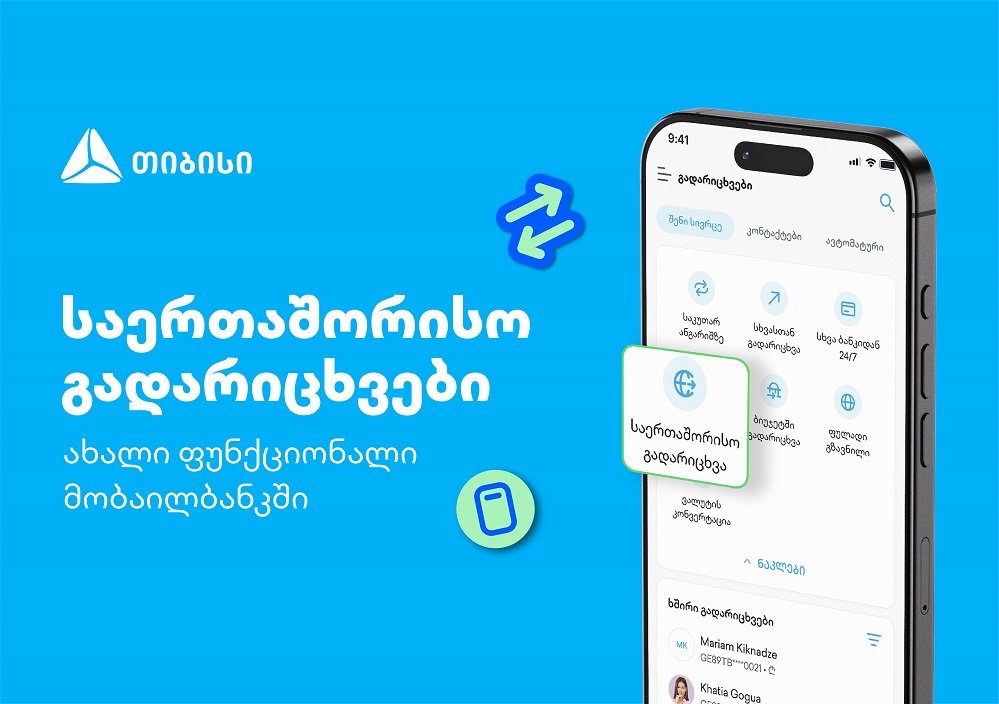 თიბისიმ, მომხმარებელთა ყოველდღიურობის გასამარტივებლად, კიდევ ერთი ახალი პროდუქტი დანერგა - მობაილბანკის მომხმარებელ ფიზიკურ პირებს საერთაშორისო გადარიცხვების განხორციელება უკვე ფილიალში ვიზიტის ან ვებ-ბანკში შესვლის გარეშე, პირდაპირ მობილური აპლიკაციიდან შეუძლიათ.