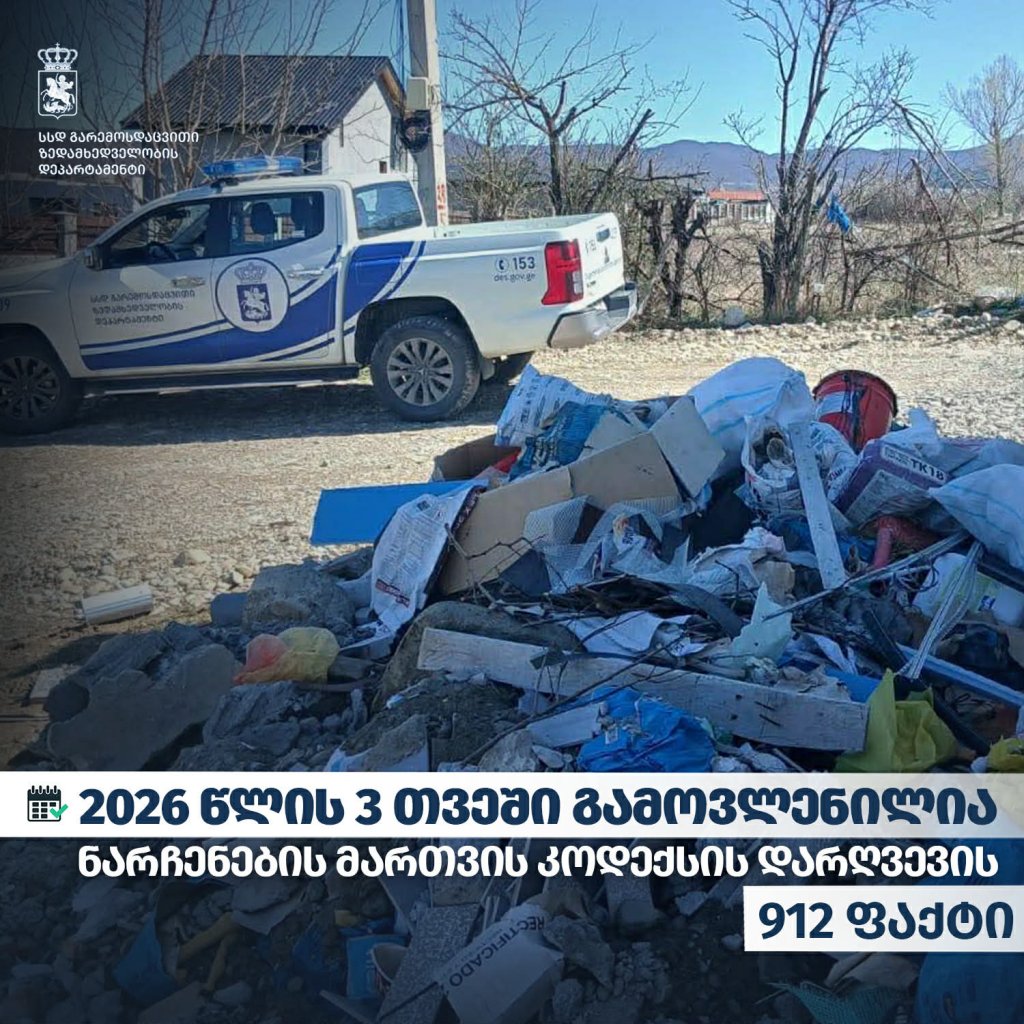 გარემოს დაცვისა და სოფლის მეურნეობის სამინისტროს გარემოსდაცვითი ზედამხედველობის დეპარტამენტის თანამშრომლებმა, 2026 წლის 1 იანვრიდან 31 მარტის ჩათვლით პერიოდში, ნარჩენების მართვის კოდექსის დარღვევის 912 ფაქტი გამოავლინეს.