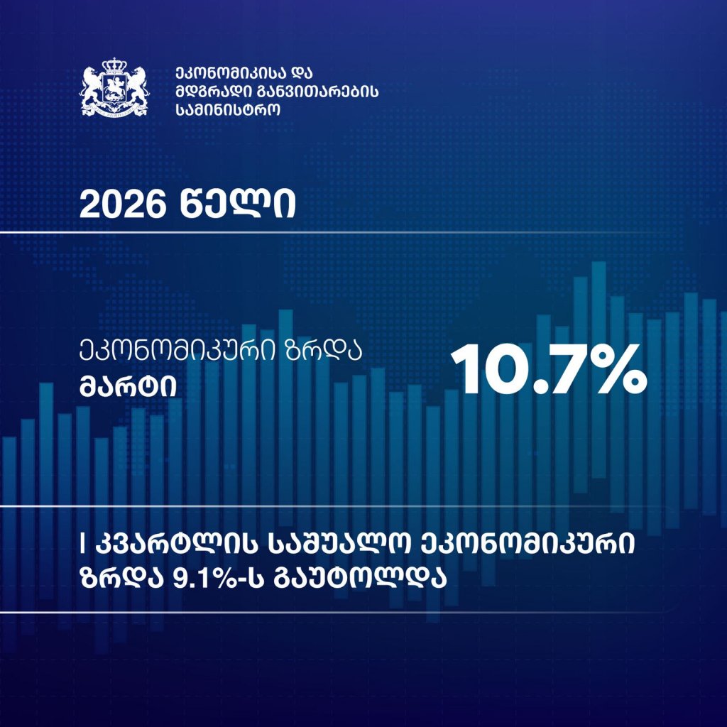 2026 წლის მარტში საქართველოს ეკონომიკა 10.7%-ით გაიზარდა, ხოლო I კვარტალში, საშუალო რეალურმა ეკონომიკურმა ზრდამ 9.1% შეადგინა.2026 წლის მარტში საქართველოს ეკონომიკა 10.7%-ით გაიზარდა, ხოლო I კვარტალში, საშუალო რეალურმა ეკონომიკურმა ზრდამ 9.1% შეადგინა.